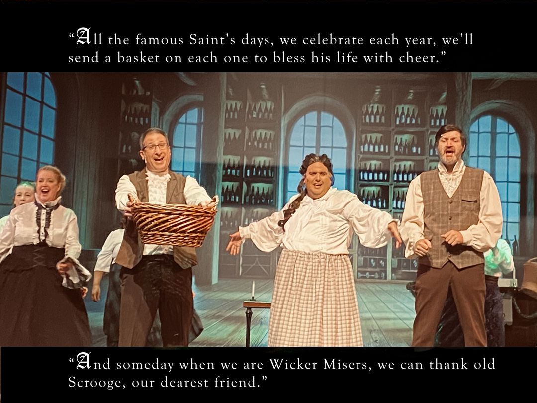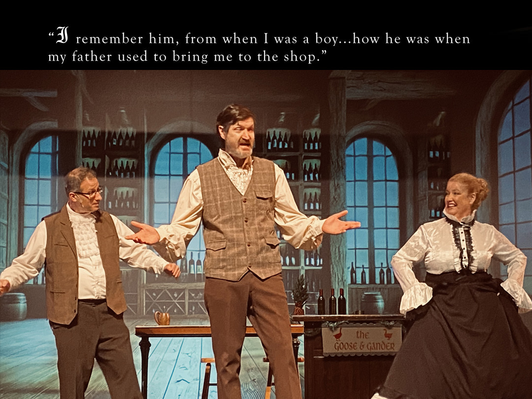 finds friends Francis and Nicholas (Scrooge’s cousin) at the Goose and Gander pub and, amid