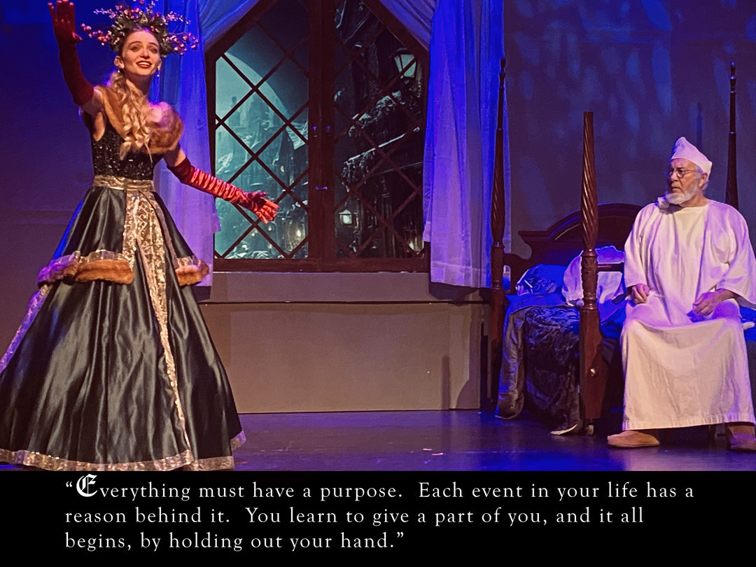Act II opens with the now ghostly Scrooge facing Christmas Present directly, as she reveals why